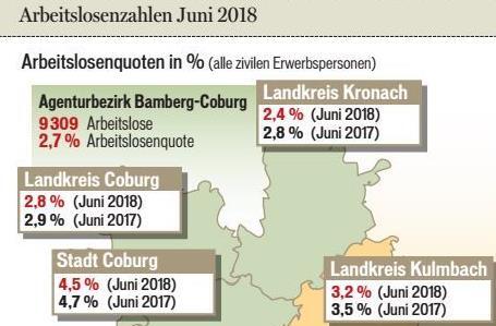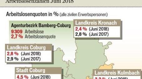 Im Landkreis Lichtenfels wurden im Juni 1154 arbeitslose Personen gezählt. Dies sind 33 Menschen oder 2,8 Prozent weniger als im Mai. Gegenüber dem Vorjahresmonat nahm die Zahl der Arbeitslosen um 97 ...