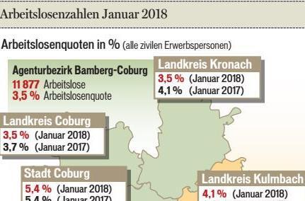 Im Raum Kronach klettert im Winter die Arbeitslosenzahl von je her saisonbedingt weit nach oben. Der Landkreis verzeichnete im Januar einen Anstieg der Arbeitslosigkeit um 316 Personen oder 30,8 Prozent auf 1341 Menschen. Binnen Jahresfrist ist die Arbeitslosigkeit jedoch um 218 bzw. 14,0 Prozent gesunken. Es verloren 9,9 Prozent (45) weniger Personen ihre Beschäftigung als vor einem Jahr.