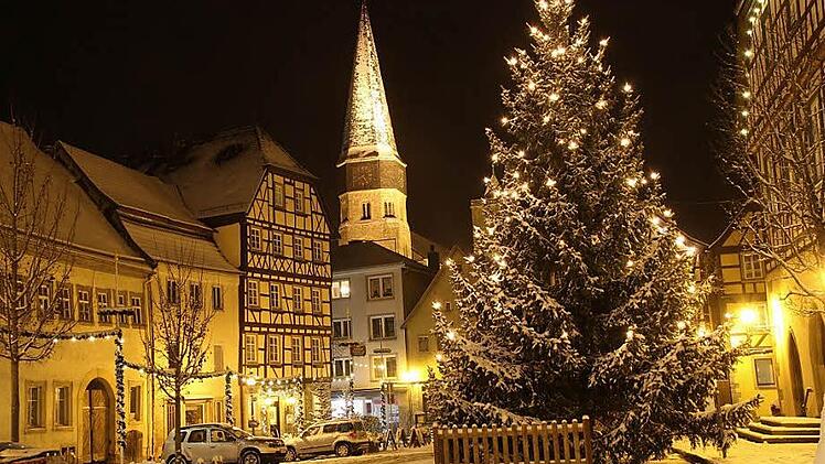 Münnerstadt — Der weihnachtliche Lichterglanz am Münnerstädter Marktplatz kommt nach den Schneefällen der letzten Tage besonders gut zur Geltung. Wenn die Dunkelheit sich über das Städtchen gelegt hat, taucht der geschmückte Marktplatz die historischen Gebäude rund herum in ein warmes Licht und verbreitet eine heimelige Atmosphäre.