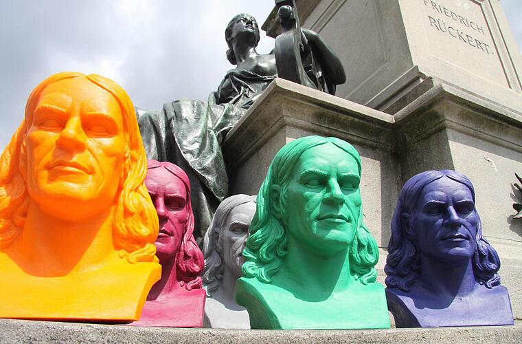 Eine der beiden Frauen im Straßencafé am Denkmal war dabei, als Anfang Juni die 32 Zentimeter hohen Rückert-Büsten aus Plastik des Konzeptkünstlers Ottmar Hörl vorgestellt wurden. Auch die "sehr informative" Ausstellung in der Kunsthalle hat sie besucht. Ähnliche Aktionen zu Kunst und Kultur wünscht sich die Frau öfters, deren Bekannte Rückert in dessen 150.