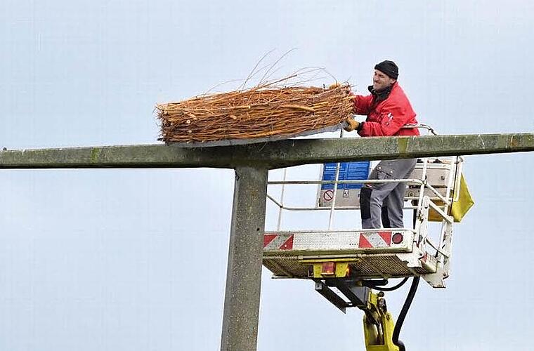 Als Thomas Fiebich mit dem Storchennest oben ankam, musste er erst einmal feststellen, dass der Mast ausgerechnet in der Mitte einen großen Stahlbolzen hat, auf dem die Nisthilfe irgendwie herumeierte. So würde wohl kaum ein Storch wohnen wollen. Fiebich und Günther mussten nun schauen, dass sie das Nest mit den mitgebrachten Seitenhalterungen zuerst ausbalancieren und dann so befestigen, dass es nicht mehr wackelt. Am Ende gelang auch das. Das Angebot für ein Storchenpaar hält.