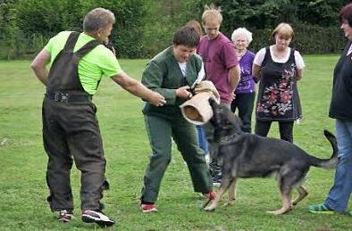 Der Ausbildungswart Alfred Nagengast zeigte Gehorsamsübungen, Sozialverträglichkeit und Schutzverhalten der Hunde im engsten Kontakt der Besucher. Außerdem zeigte er dem 13-jährigen Yannik, der vor zwei Wochen mit seinem Dackelmix das erste Mal auf den Übungsplatz gekommen ist, tiefe Einblicke eines Schutzdiensthelfers. Yannik begeisterte sich so sehr für die Ausbildung, dass er das Sommerfest als Anlass nahm, seinen Geburtstag mit seiner Familie dort zu feiern.