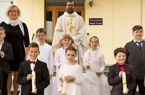 Im weiteren Verlauf des Gottesdienstes erneuerten die Kinder ihr Taufversprechen. Als Dankeschön dafür bekamen die Paten eine Rose von den Kommunionkindern. Aus der Hand von Pfarrer George Thottankara erhielten die Kinder dann zum ersten Mal die heilige Kommunion. Pfarrer Thottankara bedankte sich am Ende des Gottesdienstes bei Evi Klump und den Tischmüttern für die Vorbereitung.