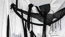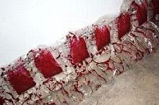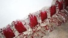 So hängt nun über den Keramiken ein mit Farbe und weiteren Materialien gestaltetes Vlies. Die Reihe mit roter Farbe gefüllter und bespritzter Beutel dort unten an der Wand, Blutbeutel, löst Schauder aus. Vera Schnitzers "letzter Engel" ist ein drapiertes weißes Tischtuch voller Risse, aber auch voller Schriftbotschaften.
