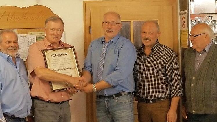 Aufgrund seiner langjährigen Treue und seines ehrenamtlichen Engagements hat der SV Marienweiher Hans-Jürgen Zimmermann zum Ehrenmitglied ernannt. Die Ehrenurkunde überreichten ihm zum 70. Geburtstag die beiden Vorsitzenden Thomas Kolb und Norbert Volk. Unser Bild zeigt (von links) Norbert Volk, Hans-Jürgen Zimmermann, Thomas Kolb, Raimund Popp und Friedbert Kolb. Foto: Klaus-Peter Wulf