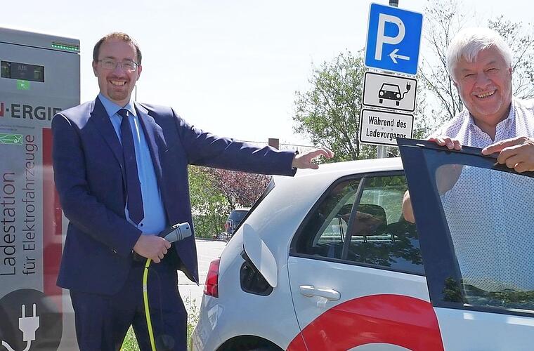 Am P+R-Parkplatz "Zu den Heuwiesen" in Neunkirchen am Brand können ab sofort zwei Elektroautos gleichzeitig mit regionalem Ökostrom geladen werden. Bürgermeister Martin Walz (CSU) nahm zusammen mit Rainer Gründel, Betreuer für kommunale Kunden bei der N-Ergie-Aktiengesellschaft, die zweite Ladesäule in Neunkirchen am Brand symbolisch in Betrieb.