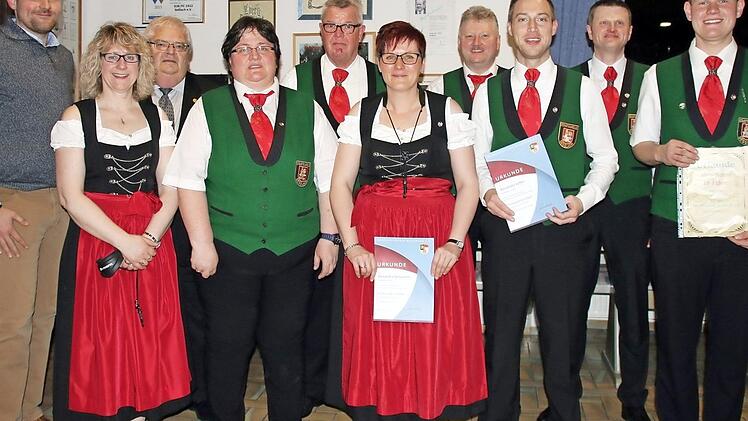 Als erstes weibliches Mitglied der Stadtkapelle leistete Ulrike Baumann einst Pionierarbeit. Nun wurde die Flügelhornspielerin für 30 Jahre Musizieren von Werner Pörner, dem Bezirksvorsitzenden des Nordbayerischen Musikbundes, mit der Ehrennadel in Gold ausgezeichnet. "Mit den Damen kam doch eine bessere Kultur in unsere Blaskapellen", gestand der Ahorner. Von der Vorsitzenden Sandra Hildebrand scherzhaft als "Silberpaar" bezeichnet, wurden Alexandra Holzwarth und Alexander Leffer: Da sie mit ihrem Tenorsaxophon beziehungsweise Trompete und Flügelhorn bereits seit 25 Jahren die Kapelle verstärken, gab es für beide die Ehrennadel in Silber. Leffer trägt das goldene Musikabzeichen, "das haben bei uns da oben auf der Bühne nicht viele", lobte Hildebrand. Dass Posaunist Niklas Sebald mit dem "Musikvirus" infiziert wurde, daran ist sein ehemaliger Lehrer Pörner mitschuldig. "Anfangs war sein Instrument noch viel größer als er", erinnerte er sich schmunzelnd. Nun konnte er den Ex-Schüler mit der grünen Ehrennadel für zehn Jahre ehren. Die hat Alfons Neumann längst erhalten. Nachdem der Tenorhornspieler inzwischen neben der Blaskapelle Neundorf auch der Seßlacher Stadtkapelle schon seit zehn Jahren die Treue hält, gab es vom Verein ein besonderes Dankeschön.