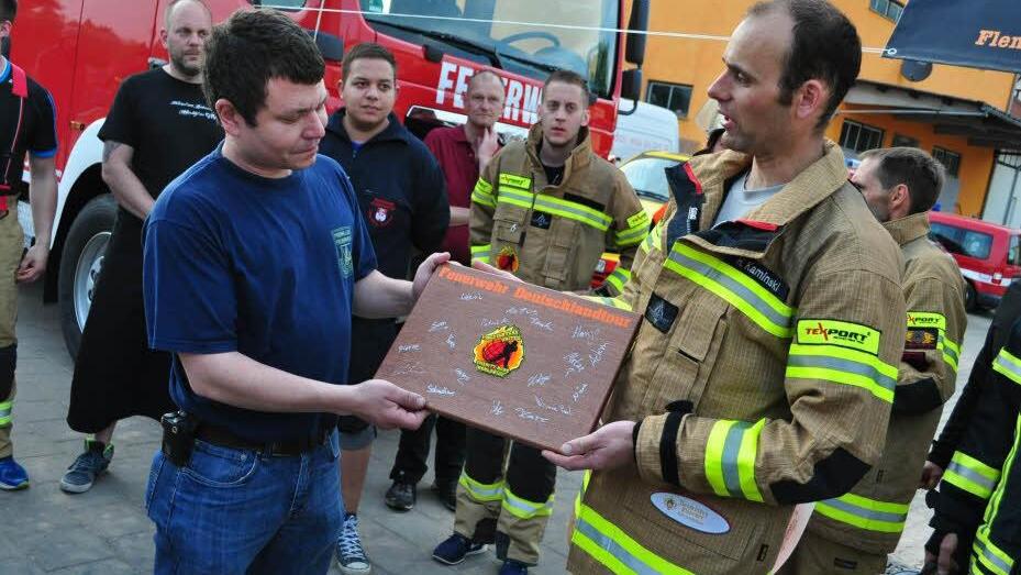 Einen Scheck in Höhe von 500 Euro überreichte symbolisch Christoph Göttel an Hanjo Kaminski. Neben Ermershausen und Maroldsweisach waren einige Feuerwehren aus dem Landkreis vertreten, wie Untermerzbach und Kirchlauter. Physiotherapeutisch wurden die Läufer von Harald Barth und seinem Team und Silke Lindner betreut. Übernachten durfte die Truppe in der Turnhalle, die die Gemeinde zur Verfügung stellte.