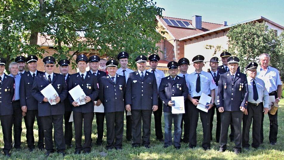 25 Jahre gehören der Feuerwehr an: Roland Bock, Matthias Bär, Stefan Boseckert, Andreas Schramm, Heiko Vogel (alle Treinfeld). Ebenfalls 25 Jahre sind Wolfgang Martin (Rentweinsdorf), Matthias Kremer, Volker Zürl, Michael Schad, Roland Hauck und Ralf Hegen (alle Sendelbach) dabei.