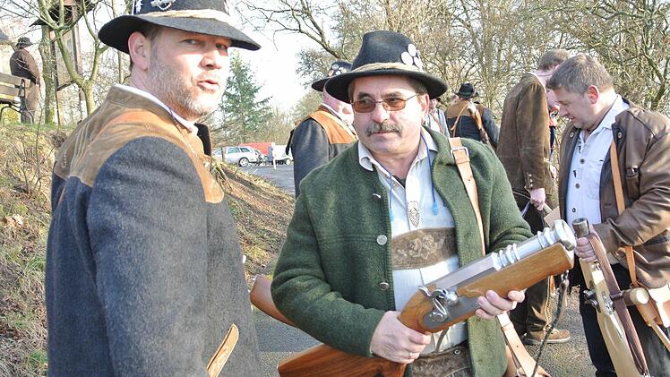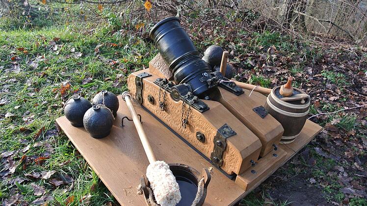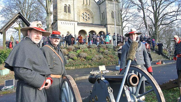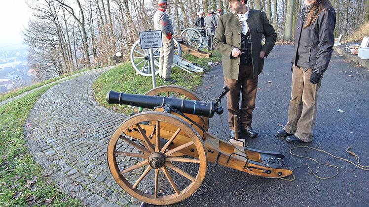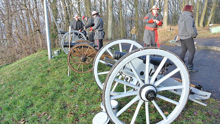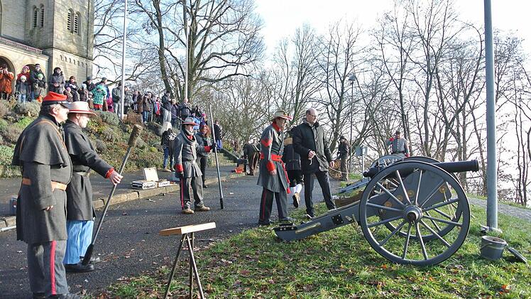 Das lässt die Mitglieder des Schützengaus Schweinfurt auch tief in die Tasche greifen. So eine Kanone, hüfthoch, kostet leicht 2000 Euro, die amerikanische Bürgerkriegskanone, die Bürgermeister Thomas Stadelmann punkt 14.30 Uhr nach dem Glockenläuten zünden darf, sicherlich mehr.