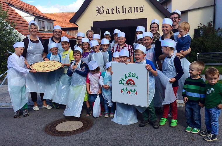 Unter der Leitung des JU-Vorsitzenden Stefan Böhm und der Pizzabäckerin Ilse Schmidt, die bereits zum 10. Mal Ihr Pizza-Fachwissen lehrte, wurde mit den kleinen Pizzabäckern der Teig vorbereitet, geknetet, belegt und im Backhaus in Wasmuthhausen gebacken. Die Kinder konnten jeden Arbeitsschritt selbst ausführen und nach Belieben ihre eigenen Pizzen gestalten.