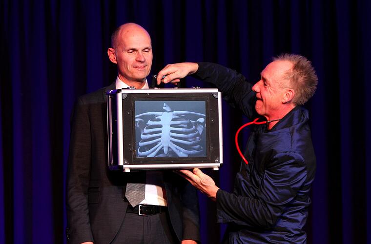 Zwischen den Talkrunden konnten die Gäste Variete-Kunst vom Feinsten genießen. Dirk Denzer selbst zeigte sich als ausgezeichneter Moderator, der immer wieder mit tollen Jonglagen und seiner Bewegungskunst begeisterte, aber auch mitder Saxophonistin Angelika Traurig einen tollen Sound lieferte. Dobs Brugal brachte mit seinem "Cyber-Koffer" und seinem "Hi-Tech-Entertainment" die vielen Besucher immer wieder zum Staunen. Dabei ließ er sogar einen "Röntgenblick" in den Körper von VHS-Geschäftsführer Holger Weiniger zu.
