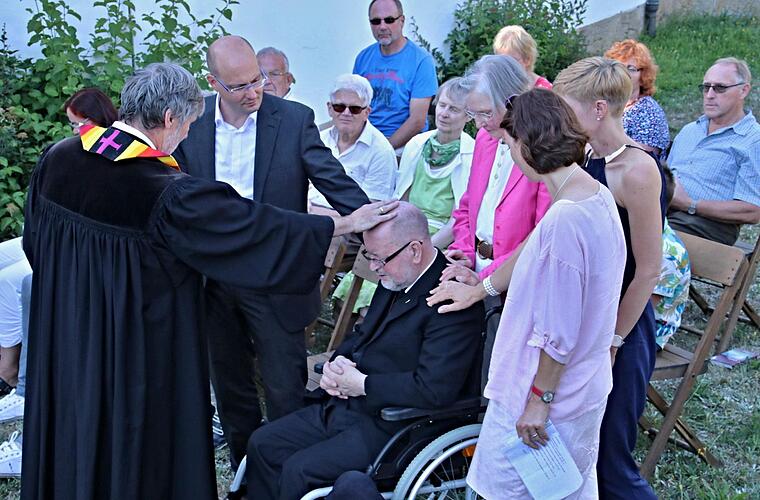 Pfarrer Grosser segnete Dietmar Lorentzen im Kreise seiner Familie. Bewegend war, als die Kinder des Jubilars ihre persönlichen Fürbitten für ihn und ihre Mutter vortrugen. Mit einem Lieblingslied von Pfarrer Lorentzen, "Der Mond ist aufgegangen", endete der beeindruckende Gottesdienst für den ehemaligen evangelischen Pfarrer von Ebern.