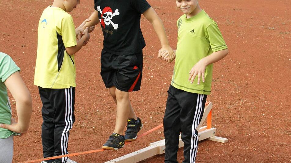 Neben den klassischen Sportarten wie Handball, Aerobic und natürlich Fußball gab es beispielsweise auch Hockey, Karate oder Golf. Geschicklichkeit und Inklusion waren ebenso Themen. So geht es nur mit Hilfe rückwärts über die Slackline, und auch beim Blind-Fußball waren die Teams gefordert - und die Kinder erlebten ein bisschen, was es bedeutet, mit einer Behinderung zu leben. Geschicklichkeit war an vielen Stationen gefragt, etwa am "heißen Draht" der Sparkasse, beim Zielspritzen der Feuerwehr, am Kletterfelsen des Landkreises oder bei den Jonglage-Übungen.