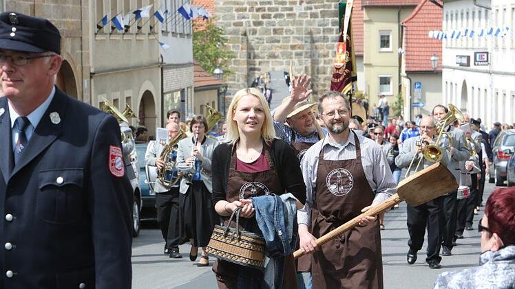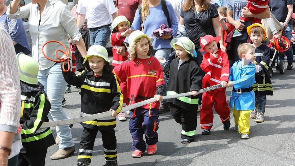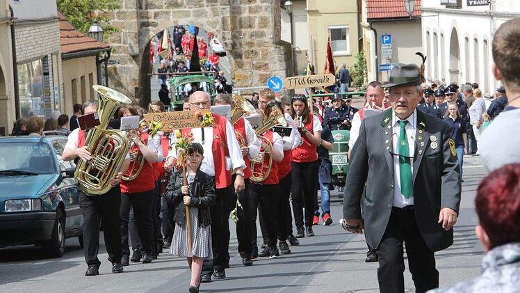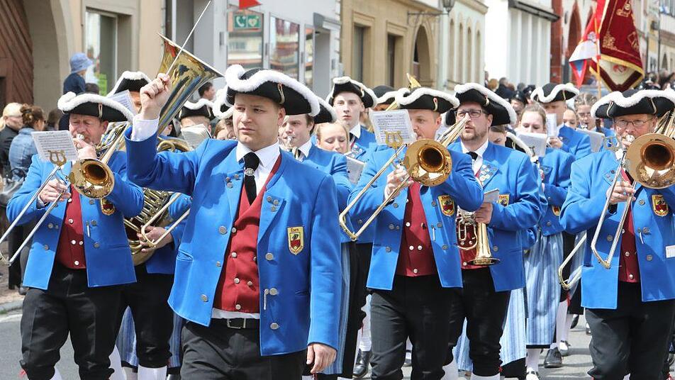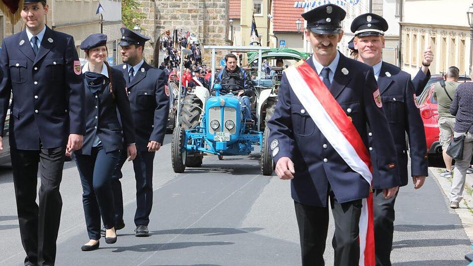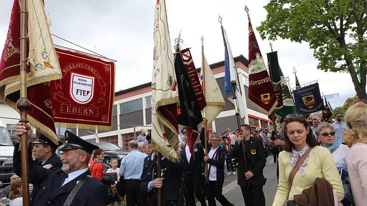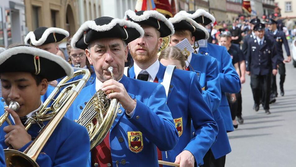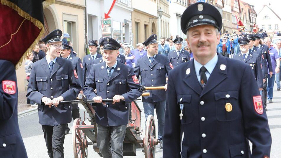 Ein bombastischer und bunter Festzug bewegte sich durch die Straßen der Altstadt in Ebern: 80 Gruppen und Vereine, sieben Kapellen, dazwischen immer wieder antike Feuerwehrpumpen, welche die einzelnen Wehren stolz präsentierten. Auch das Wetter spielte mit, bis der Festzug "durch" war. Später goss es dann aus allen Wolken.