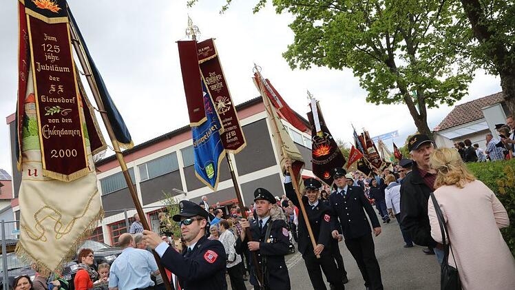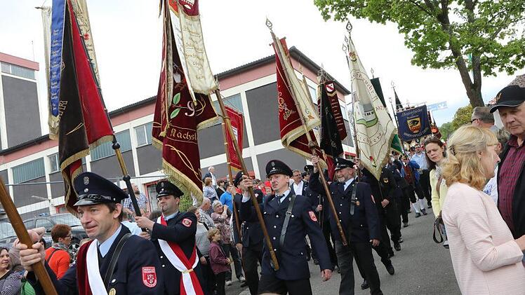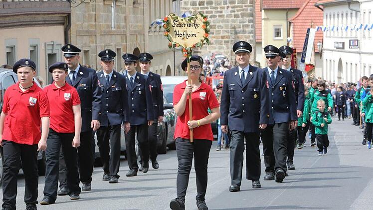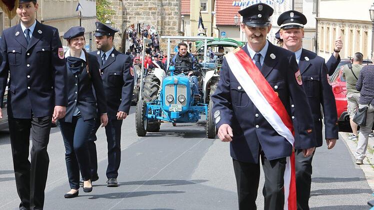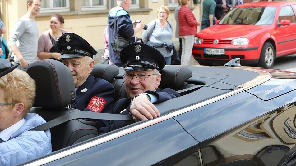 Oft stockte der Festzug, weil es am Festplatz beim Feuerwehrgerätehaus Stau gab, als die Gruppen ankamen. Begrüßt wurden sie dort von Moderator Eberhard Wohl, dem Schirmherrn des Jubiläums, Landrat Wilhelm Schneider und MdL Steffen Vogel (beide CSU) sowie von Bürgermeister Jürgen Hennemann (SPD), der Eberner Feuerwehrführung und den Männern der Feuerwehrdienstaufsicht mit Kreisbrandrat Ralf Dressel an der Spitze.