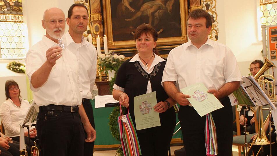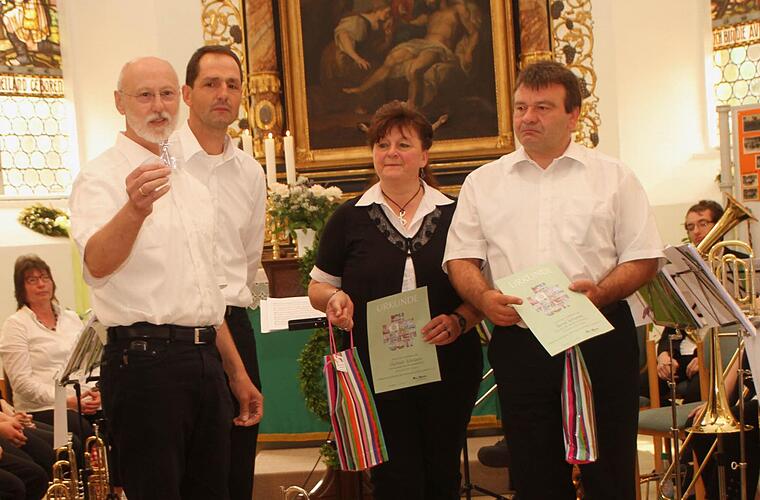 Klaus Eisenacher bedankte sich bei allen Mitwirkenden, insbesondere Pfarrer Volkmar Gregori und Bezirkschorleiter Jürgen Koch und den Mitwirkenden für diesen schönen musikalischen Festgottesdienst. Für 40-jährige Mitgliedschaft und aktives Spiel wurden Gabi Schramm und Bernd Schramm ausgezeichnet. Schließlich traf man sich im Pfarrgarten zum Sektempfang.