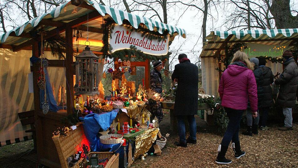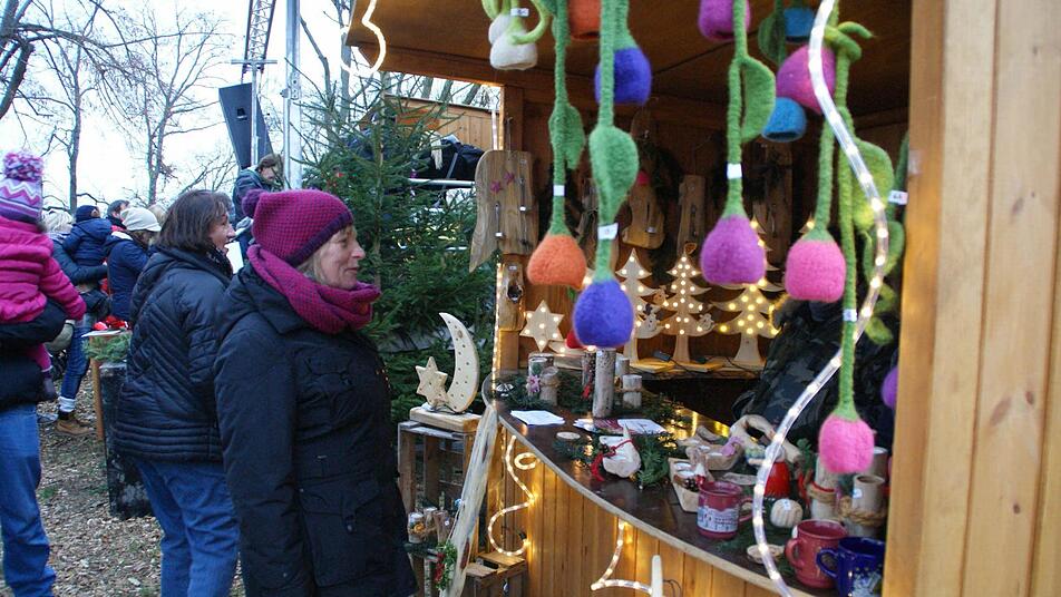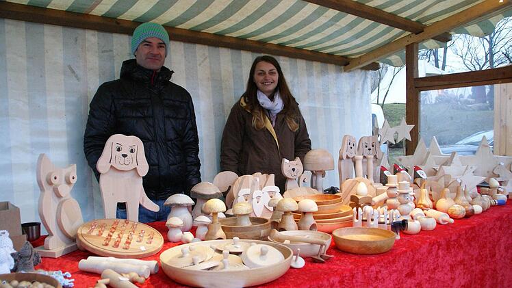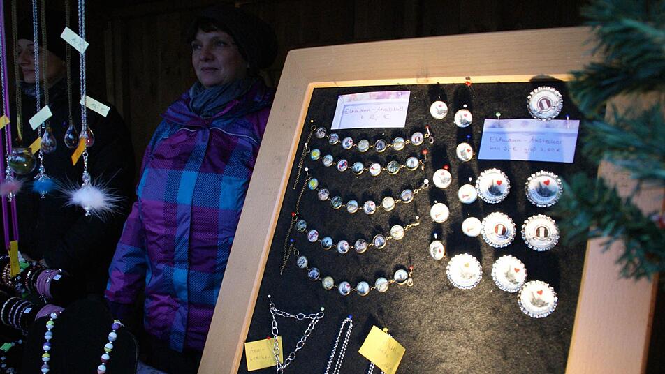 So wie Werner Singer wollten mit der Wallburg-Weihnacht auch andere ein gutes Werk tun. So gab es an vielen Ständen die Wallburg-Weihnacht-Tasse, deren Verkaufserlös bedürftigen Bewohnern des Seniorenheims Eltmann zugute kommen soll. Bei Thorsten Tröster und Veronique Partosch, die ideenreiche Holzprodukte verkauften, bekamen Interessenten an kleinen Pilz-Anhängern den Wunsch: "Bitte eine Spende in die Box für die Station Regenbogen". Der Geist, den Christkind Josefa beschworen hatte, war also durchaus gegenwärtig.