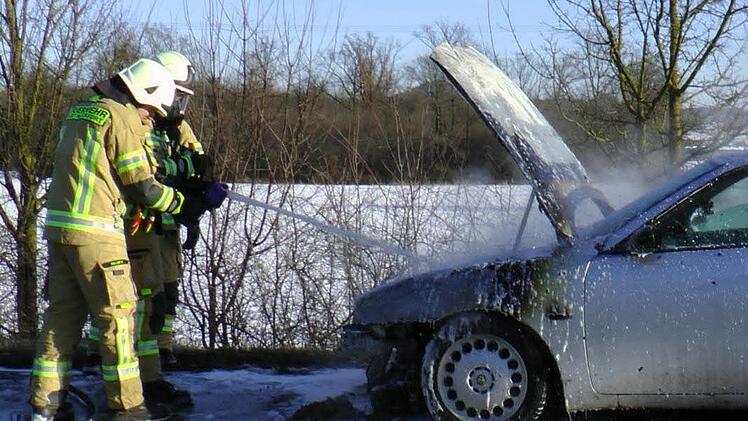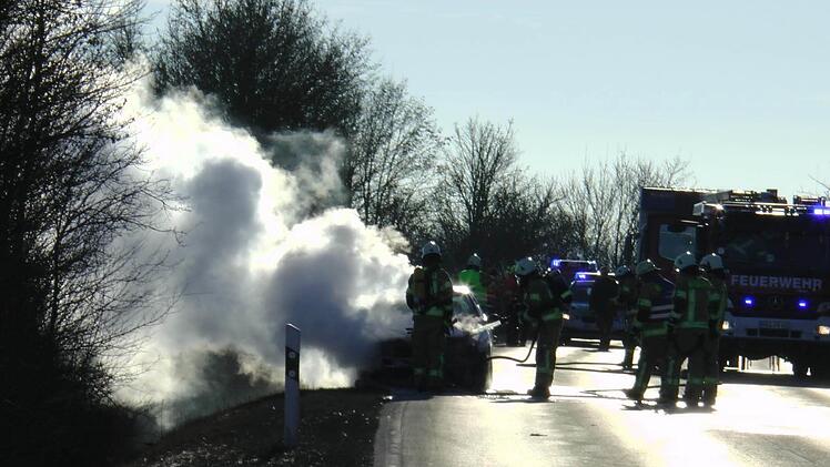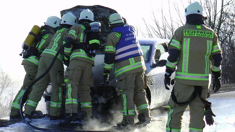 Ein Auto fing auf der Strecke Haßfurt-Hofheim in Höhe Sylbach Feuer und wurde total zerstört. Die Einsatzkräfte mussten besonders vorsichtig vorgehen.