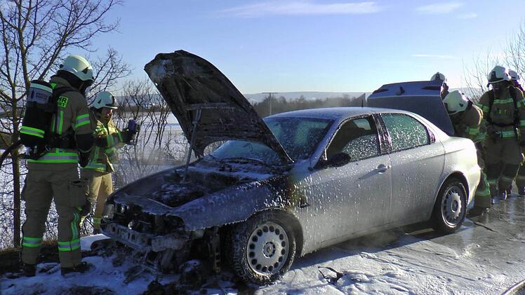 Ein junger Mann aus dem nördlichen Landkreis war gegen 14.30 Uhr unterwegs in Richtung Hofheim, als er Flammen aus dem Motorraum seines Alfa Romeos wahrnahm. Geistesgegenwärtig hielt er am Straßenrand an, verließ sofort das Auo und alarmierte die Feuerwehr.
