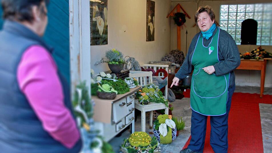 Erika-gewachst! Mhm... oder doch lieber knallgrüne Filzrosen? Mal ganz abgesehen von der Farbwahl, steht fest: Auf dem Hof von Wolfgang und Maria Müller gibt es viele schöne Sachen - in Herzform, als Kranz, in einer Schale, als Kette... viele bunte Gestecke, und das nicht nur für den bevorstehenden katholischen Feiertag Allerheiligen. "Manche finden aber auch, das sind alles einfach nur Staubfänger", sagt Maria Müller. Das Künstler-Credo "Geschmäcker sind verschieden" gilt wohl auch in dieser traditionellen Handwerks-Szene.