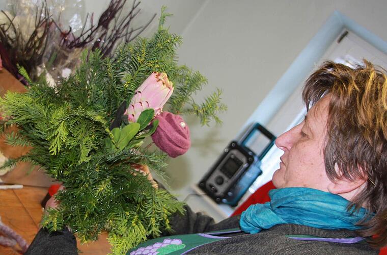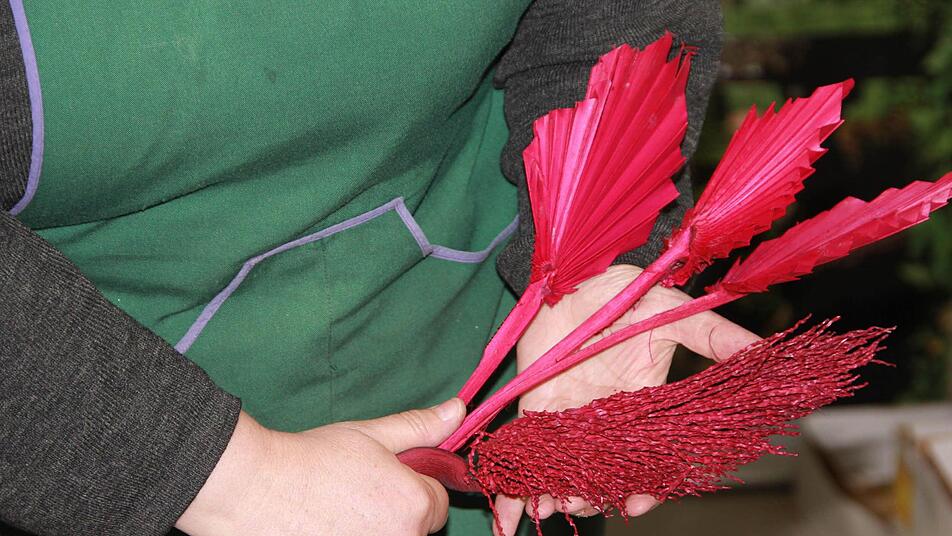 Nicht nur im Hof, der Scheune, Garage oder auf der Treppe zum Eingang reihen sich Grabgestecke, kleine Buchsbäumchen und Erika-Töpfchen nebeneinander - das ganze untere Stockwerk des Familienhauses ist voll mit buntem Krempel. In weißen Schuhkartons verteilt, und auf Biertischen gestapelt. Ein kreatives Chaos, durch das sich allein die Hausherrin zu wursteln weiß. "Als ich noch auswärts Kurse gegeben habe, musste ich immer Kisten schleppen", sagt Maria Müller und erinnert sich, wie sie am Anfang ihrer Floristen-Karriere - in ihrem Fall ohne offiziellen Ausbildungsgrad - den Hausmeister herzlich bestechen musste, wenn die bastelnden Frauen zur Sperrstunde noch nicht ganz fertig waren. Wenn sie die Kurse jetzt, wie dieser Tage für den Eltmanner Obst- und Gartenbauverein, gibt, dann hat sie alles in Griffweite.