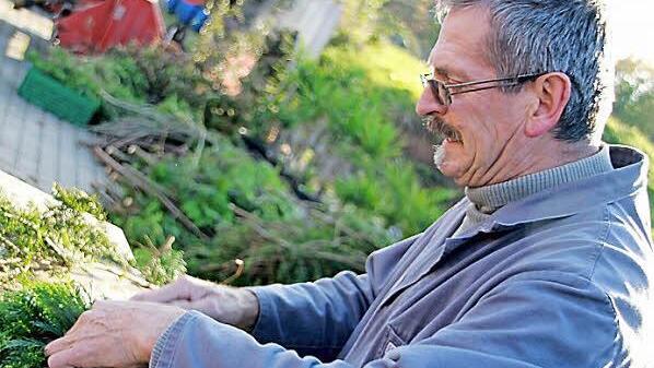 Er steht an den Nachmittagen vor Allerheiligen oft draußen im Hof. Im blauen Arbeitskittel, der gar nicht mehr so richtig blau, sondern eher grau ist. Hinter ihm stapeln sich Haufen mit Astwedeln. Grüne Tannenzweige würde der Laie vermutlich behaupten. Aber: "Alles Koniferen", sagt Müller, "Koniferen sind nämlich weicher und länger haltbar, die nadeln nicht so." Einen floristischen Merkspruch gibt es von ihm auch dazu: "Die Fichte sticht, die Tanne nicht."