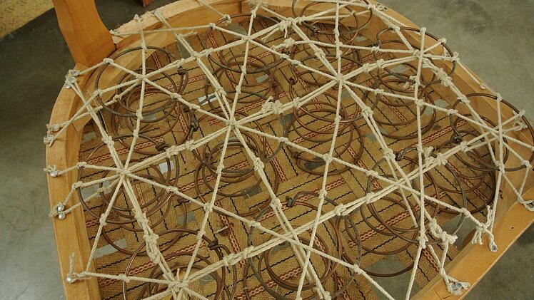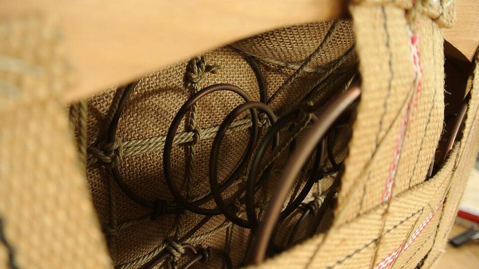 Ernst Sauerschell beherrscht die Kunst, eine Federkernpolsterung aufzubauen: Da werden die schweren Gurtbänder gezogen; sie tragen die Stahlfedern, mit ersten Stichen fixiert; darüber legt sich die französische Schnürung, die die Federn hält, Leinwand, "Afrik" ("Palmfasern, "früher hat man auch Seegras genommen") und wieder Leinwand; alles miteinander sorgfältig über Lasierstich und viele weitere Stiche von oben nach unten und zurück fixiert, bevor die Metallkante mit vielen Haltestichen aufgebaut wird und endlich mit Rosshaar, Watte und Nessel das Ende naht.