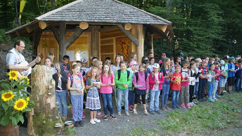 Unterstützt von Rauhenebracher Schulkindern mit kräftigem Gesang, spendete Pfarrer Kurt Wolf dem Erlebnispfad den kirchlichen Segen. Die Kinder erkundeten gleich die Stationen, die die breite Öffentlichkeit ab Sonntag, 14 Uhr, beim Aktionstag erleben kann.