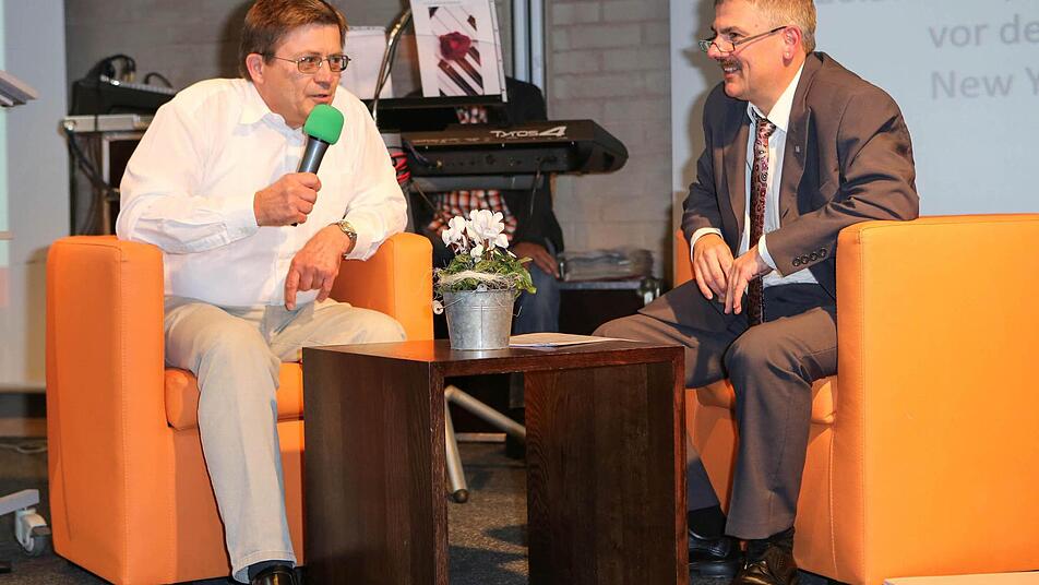 1973, bei seinem Einstieg bei Kugelfischer, habe ein fester Beruf noch bedeutet, dass man sicheres Geld nach Hause bringen und eine Familie gründen konnte, sinnierte Golonka im Gespräch mit dem Gewerkschaftsbevollmächtigten Matthias Gebhardt. Heute sei dies leider nicht mehr so unmittelbar der Fall. Wenn er sich etwas wünschen dürfte? "Es sollte genug Arbeit da sein," meinte der verheiratete Vater zweier Kinder, "damit wir eine Zukunftsperspektive haben". Die FTE-Standorte Ebern und Fischbach sollten gesichert bleiben, erhofft er sich. Der Plausch fand unter vier Augen auf einer Couch statt, scheinbar gemütlich und dennoch vor großem Publikum.