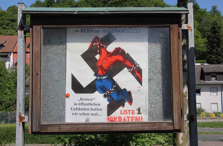 Aufregung in Eltmann: Im SPD-Schaukasten am Schwimmbad hatte der Ortsverein ein älteres SPD-Plakat aufgehängt - nun musste sie es auf Druck des Bezirksverbands Unterfranken wieder entfernen. Mit dem Plakat hatte sie den Kreuz-Erlass von Ministerpräsident Markus Söder (CSU) mit den Hakenkreuzen der Nazis verglichen.