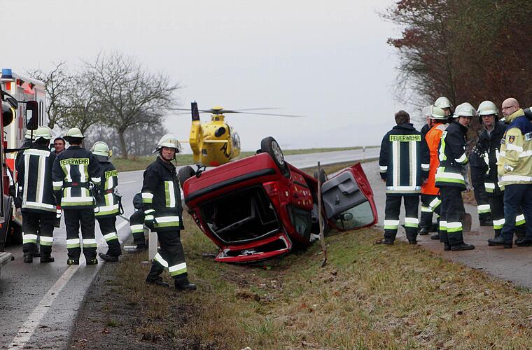 Beim Aufprall auf die Böschung überschlug sich der Pkw und blieb im Straßengraben auf dem Dach liegen. Der 44-jährige Beifahrer wurde im Fahrzeug eingeklemmt und musste von der Feuerwehr aus dem Fahrzeug befreit werden.