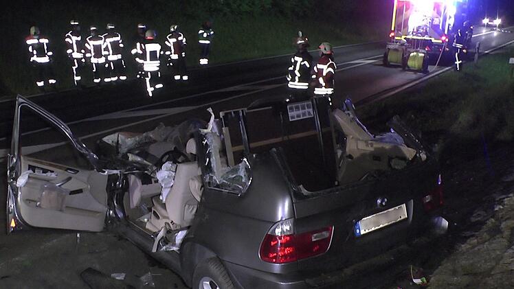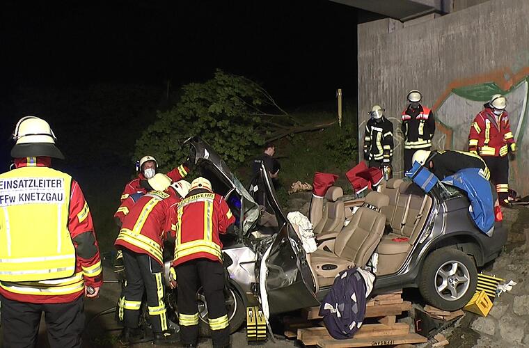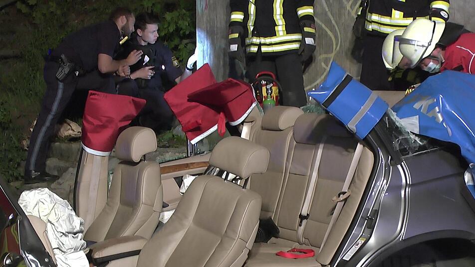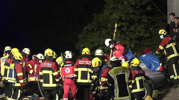 Während die 33-jährige Beifahrerin durch den Rettungsdienst aus dem zerstören Auto rasch befreit werden konnte, gestaltete sich die Rettung des Fahrers schwierig. Im Beinbereich eingeklemmt, dauerte die Bergung des Mannes fast eine Stunde. "Nach Anweisung des Notarztes wurde die Person mit der hydraulischen Rettungsschere und Spreizer befreit", berichtete Einsatzleiter Manuel Smuda, der auch Zweiter Kommandant der Feuerwehr Knetzgau ist. Hierbei mussten das Fahrzeugdach abgetrennt sowie eine Tür und die B-Säule entfernt werden. Das Lenkrad wurde nach oben gezogen, und nachdem die Beine frei waren, wurde der Patient über ein Spineboard aus dem BMW gebracht.