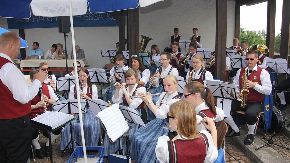 Am Nachmittag wurden im idyllisch gelegenen Rathaushof viele Erinnerungen zwischen ehemaligen und noch aktiv arbeitenden "Bankern" ausgetauscht, aber auch mit den Kunden der Bank die zum Feiern gekommen waren, gab es Gespräche. Zur Unterhaltung spielte das Blasorchester Ebern unter Stabführung seines Vorsitzenden, Theo Lerche.