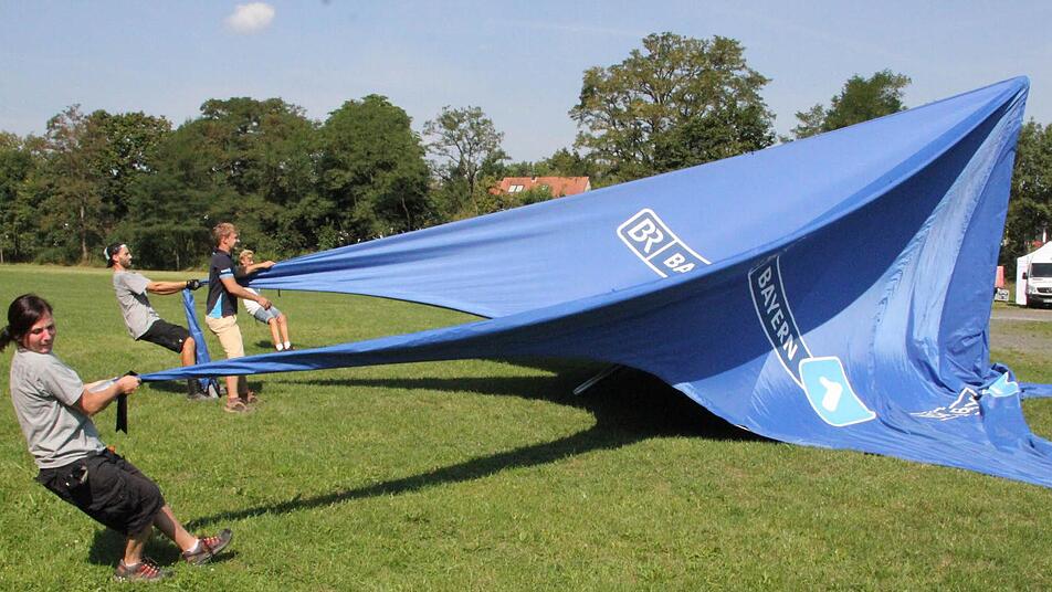 Der Himmel der Bayern ist auf dem Boden des Festplatzes Gries in Haßfurt gelandet. Weiß-Blau ist es dort, die Stimmung ist gut und die Menschen trinken zwar kein Bier, aber süffiges Limo. Bayern 1 macht scheinbar nicht nur im Radio, sondern auch im wirklichen Leben gute Laune. Und das, obwohl die gut 30 Menschen beim Aufbau der vierten Sommerreise-Station des Radiosenders buckeln und schwitzen. Am Sonntag um 14 Uhr startet die Sommergaudi, bei der auch der FT präsent ist.
