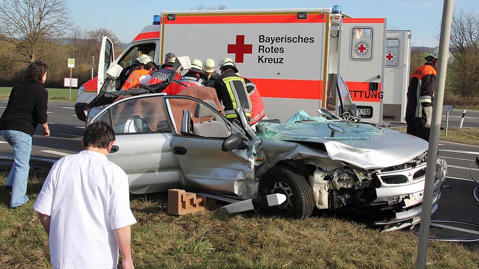Nach Einsatz einer Rettungsschere gelang den Feuerwehrhelfern die Rettung des Verletzten, der noch an Unfallstelle von Rot-Kreuz-Helfern sowie einem der Chefärzte aus der Eberner Haßbergklinik versorgt und dann ins Krankenhaus gebracht wurde.