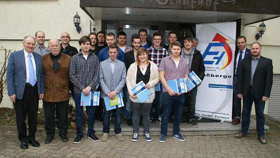 Absolventen: Lukas Bayer aus Kerbfeld (Elektrotechnik Hümmer Hofheim), Isabell Dietzel aus Albershausen (GEuppert Elektrotechnik Hofheim), Jonas Döllner aus Westheim (Elektroservice Bergmann Sand), Johannes Freibott aus Ebern (Elektro Fertsch Ebern), Tobias Graser aus Eltmann (Elektro Hümmer Eltmann), Tim Helbig aus Zeil (Märkl Elektro aus Ebelsbach), Marco Hofmann aus Limbach und Kevin Lorz aus Stettfeld (beide Häfner