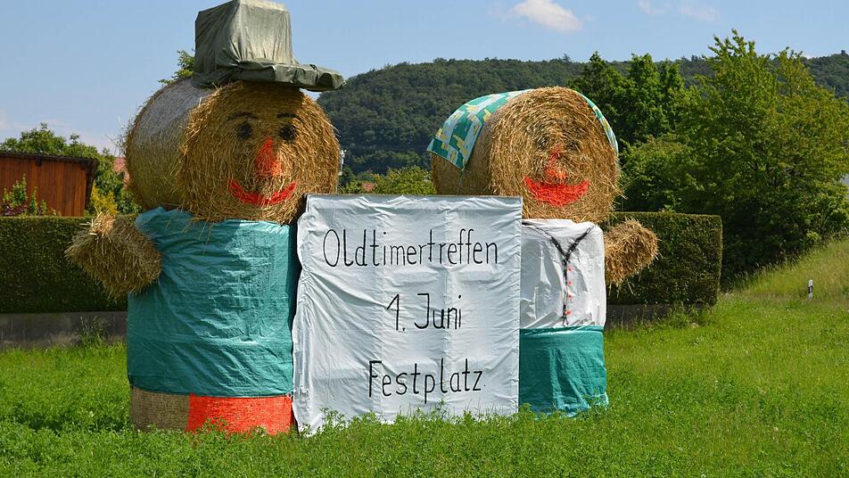 Zu Beginn der Fahrt gibt es ein Problem. Der große Mähdrescher will einfach nicht durch die von Autos zugeparkte Straße passen. Doch durch eine Routenänderung kann die kleine Komplikation überwunden werden. So geht es an den beiden Strohmännchen vorbei, die schon seit einigen Wochen das Treffen ankündigen, hinaus auf die Limbacher Flur.