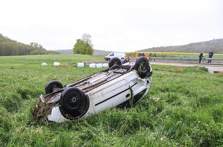 Gegen 11:40 Uhr befuhr ein 20-jähriger Opel-Fahrer mit seinem 15-jährigen Beifahrer die Staatsstraße 2258 von Karbach kommend in Fahrtrichtung Fabrikschleichach. Das Auto kam aus bislang noch ungeklärter Ursache nach rechts von der Fahrbahn ab und überschlug sich mehrfach im angrenzenden Acker.