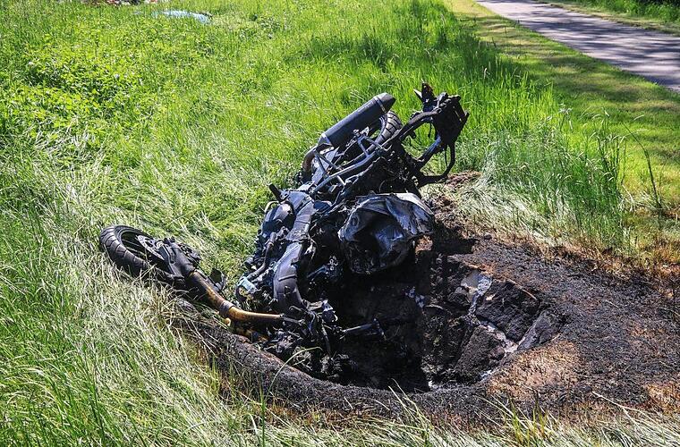 In der Folge kollidierten beide Fahrzeuge frontal. Der 46-jährige Motorradfahrer aus dem Landkreis Rhön-Grabfeld stürzte schwer, seine Suzuki rutschte in den Straßengraben und fing Feuer. Zeugen leisteten sofort vorbildlich Erste Hilfe. Sie wählten außerdem den Notruf, kümmerten sich um den Schwerverletzten und versuchten das Motorrad mit Feuerlöschern zu löschen.