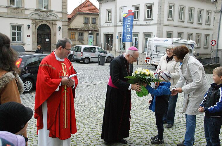 69 Jugendliche aus der Pfarreiengemeinschaft Main-Steigerwald versammelten sich gestern Morgen mit Paten und Familienangehörigen in der Stadtpfarrkirche St. Michael und Johannes der Täufer, um das Sakrament der Firmung zu erhalten. Weihbischof Ulrich Boom freute sich über die Begrüßung, die ihm schon vor dem Gotteshaus die Kinder des städtischen Kindergartens bescherten.