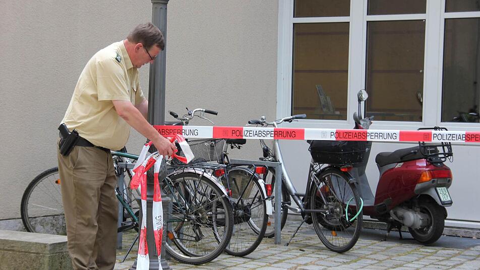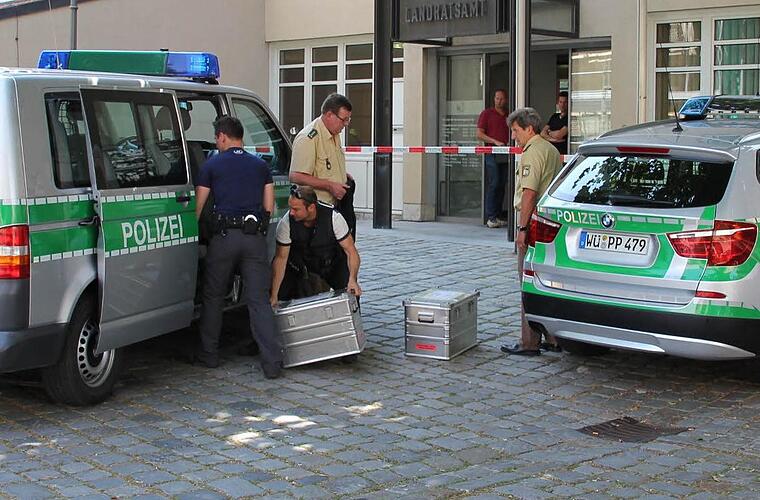 Die Ermittlungen nahmen Kripobeamte aus Schweinfurt und Würzburg auf, per Polizeihubschrauber wurden zwei Experten der technischen Sondergruppe des Landeskriminalamtes eingeflogen, die mit ihrer speziellen Ausrüstung um 12.15 Uhr am Landratsamt vorfuhren und schon eine halbe Stunde später Entwarnung gaben. Haßfurts Polizeichef Kurt Förg schickte die wartenden Sanitäter nach Hause und entfernte eigenhändig die Absperrung in Richtung Zulassungsstelle.