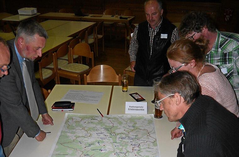 Die zunächst leeren Landkarten enthielten schließlich zahlreiche Eintragungen besonders bei einzutragenden Erlebnisstationen und sonstigen Anziehungspunkten. Den Radfahrern braucht es in der Baunach-Region nicht langweilig werden, war der einstimmige Tenor. Lückenschlüsse fand man besonders für Ebern nötig, denn der Weg durch die Stadt sei sehr unfreundlich für Radfahrer. Auch sonst wurden noch einige sinnvolle Varianten gefunden.