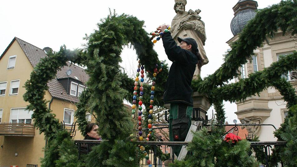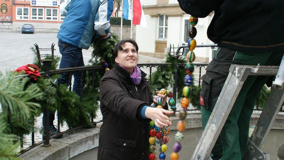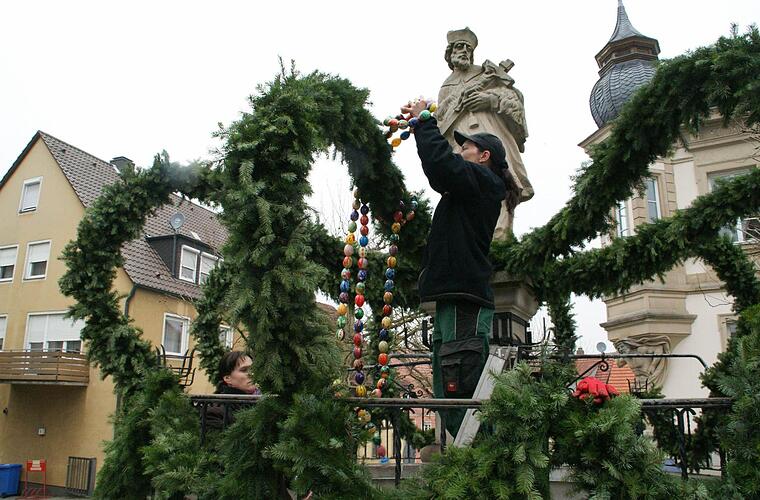 Wenn alle Girlanden fertig sind, kommt wieder der Bauhof ins Spiel. "Die Städtischen" montieren die Krone fachgerecht auf den Brunnen - einige Zeit nach Ostern bauen sie den Aufbau auch wieder ab und lagern alles im Bauhof ein.