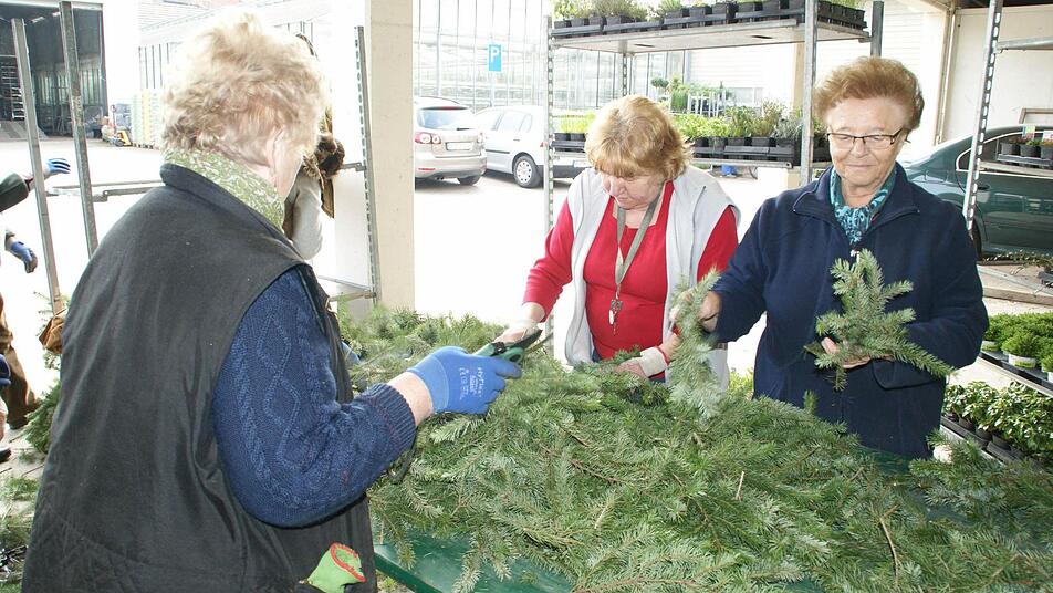 Fast zwei Anhänger voll "Wedel" also Tannen- beziehungsweise Fichtenzweige hatten die städtischen Bauhofarbeiter dafür aus dem Stadtwald geholt und an der Gärtnerei Nusser abgeladen. Die Gärtnerei stellte nicht nur die Örtlichkeit, sondern auch Floristin Katharina Krines, denn das Binden der Girlanden ist nicht jedermanns Sache. 80 Meter flexible Girlande sind nötig, um das Brunnengeländer zu umkränzen, dazu kommen die sechs Metallbögen, die die Krone bilden. Gabriele Krönert, Helma Kruas und Selma Heil sorgen für Nachschub zum Binden: die Zweige müssen von den Wedeln abgezwickt und zu Bündeln zusammengefasst werden, sie wandern dann zu den Bindern.