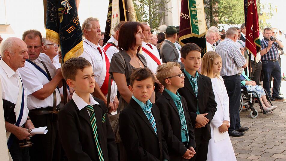 Feierliche Prozession durch das ganze Dorf In einer Prozession bewegte sich der große Zug durch den mit Fahnen, Fähnchen an den Häusern und Bäumchen geschmückten Ort zur Kirche St. Ägidius, welche die mehr als 800 Besucher gar nicht fasste. Deswegen wurde der Festgottesdienst auf eine Großleinwand nach außen übertragen.