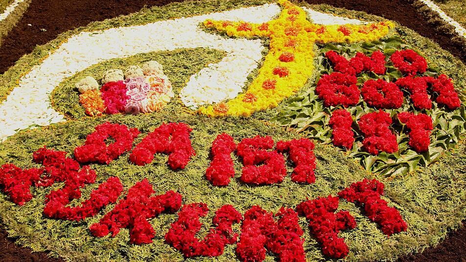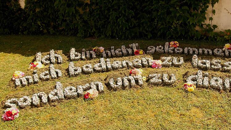 Bei Gebeten und Liedern kam immer wieder der Primizspruch des Neupriesters Christian Montag durch. Chor, Bläser und das Orgelspiel schmückten den Festgottesdienst. Den Primizspruch hatten Frauen vor dem Gotteshaus in einem Blumenbild und in Stein gestaltet.