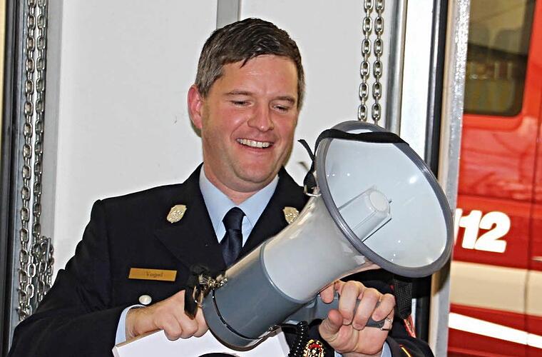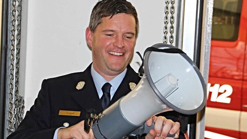 Bei der Übergabe des neuen Tanklöschfahrzeugs an die FFW Wasmuthhausen erhielt deren Kommandant Christian Vogel ein Megafon.