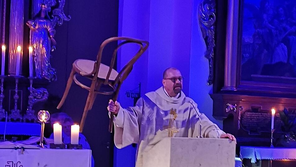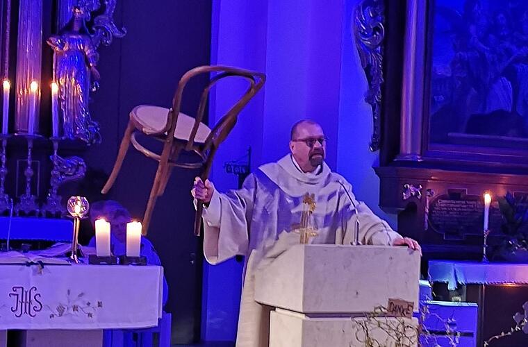 Diakon Bernhard Trunk wurde in einem Dankgottesdienst in Sand in den Ruhestand verabschiedet. In den Mittelpunkt seiner Predigt stellte der Diakon einen Stuhl - und trug anschließend ein bekanntes Lied mit eigenem Text vor.