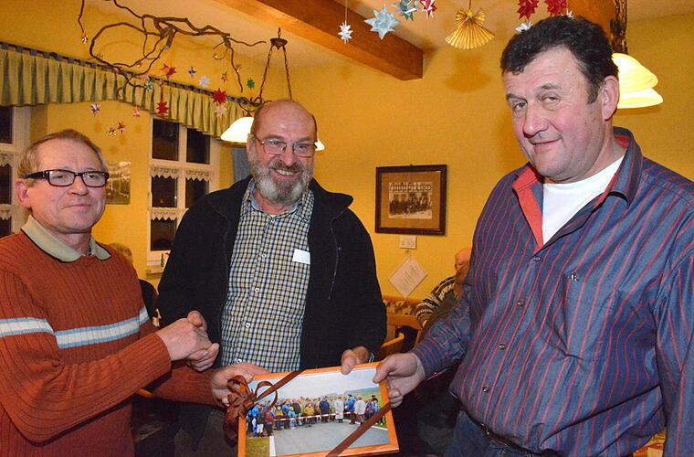 Manfred Schramm in Vertretung der Dürrenrieder Bürger überreichte an die Käßlitzer Bürger als Dank für die Ausrichtung der Gedenkfeier ein Bild der Straßenöffnung, das Ingo Wolfschmidt, der "Motor" der Käßlitzer Bürgerschaft entgegennahm.